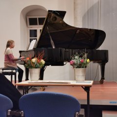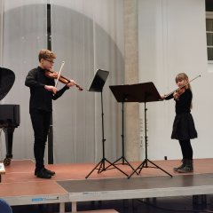Zum Schluss des Konzertes hören wir zwei erfahrene Wettbewerbsteilnehmer*innen. Nicole Drachlov (Violine) und Nicolette Franke (Viola) sind in der Alterstufe V angetreten und haben schon einige Wettbewerbe und viele Konzerte mit der Unterstützung ihrer Lehrerin Sylvia Gassert gemeistert. Sicher, mit großem Ton und sehr ausdrucksstark interpretieren sie das Madrigal Nr. 2 von Bohuslav Martinu. Sie werden mit großem Applaus belohnt.