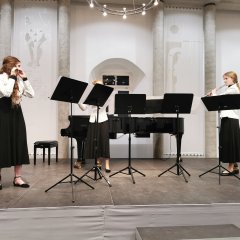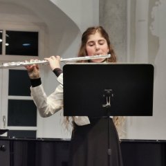 Zur Eröffnung des Konzertes spielen Emilja Baksyte, Querflöte und Diana Vettermann, Trompete aus ihrem „Jugend musiziert“ Duoprogramm zwei flotte Sätze von David McKeown. Henri Aßmann zeigt sein Können mit “Trumpet Voluntary“ von John Stanley und einem Satz aus der romantischen Sonata Nr.1 von James Hook. Beide Trompeter*innen haben Unterricht bei Rozmurat Arnakuliyev. Esra Hehrmann hat mit ihrer Schülerin Emilija Baksyte eine Air von Jules Demersseman vorbereitet. Sie ist erst 10 Jahre alt und spielt schon erstaunlich virtuos. Dania Vettermann wurde nach einem Jahr Trompetenunterricht in die Begabtenförderung aufgenommen. Im Konzert trägt sie ein barockes und ein modernes Werk vor. Ihre Schwester Joana Vettermann zeigt ihre Musikalität mit dem dritten Satz aus einem romantischen Flötenkonzert von dem Flötisten und Komponisten Ernesto Köhler. In der Pause bewirtet der Förderverein der Städtischen Musikschule mit Getränken und Knabbereien. Nun geht es weiter mit der Flötistin Ida Schmidt und dem ersten Satz eines klassischen Flötenkonzertes von Carl Stamitz. Ida zeigt sich sehr souverän. Der einzige Streicher am heutigen Abend ist Giulien Reber. Er erhält Bratschenunterricht bei Sylvia Gassert und spielt im Streichquartett. Auch er spielt, mit viel Musizierfreude, einen Satz aus dem klassischen Konzert von Joseph Schubert, nicht zu verwechseln mit seinem Namensvetter Franz Schubert. Leni Assenheimer meistert das virtuose Concertino von der Komponistin Cecile Chaminade mit Bravour. Das Querflötentrio von Esra Hehrmann bildet mit dem modernen, experimentellen „Nuraghi Warriors Dance“ von dem jungen Komponisten Anze Romann mit viel Temperament einen glanzvollen Abschluss. Das Publikum zeigt seine Begeisterung mit großem Applaus. Ein besonderer Dank gilt unserer Pianistin Olena Sinchuk, die alle Solobeiträge begleitet hat.